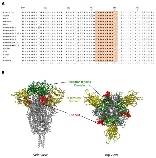 Sequence conservation of peptide 572–581 (TDAVRDPQT) and the position of the epitope in the SD1 regions of the full index strain spike protein trimer. (A) An amino acid sequence alignment of the partial SARS-CoV-2 spike protein encompassing the SD1 and peptide (highlighted in peach) targeted in animals with cross-neutralization capacity. (B) The position of the SD1 peptide on the crystal structure of the spike protein indicated in red spheres. The receptor binding domain is in green and the N-terminal domain is in beige. Asterisk (*) refers to identical amino acids in all sequences. Substitutions are indicated in grey.