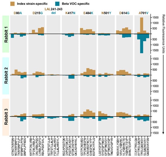 Each subarray included peptides with specific amino acid changes within the Beta spike protein. These include amino acid substitutions D80A, D215G, K417N, E484K, N501Y, D614G, and A701V, and deletion LAL241–243del. Of these, mutations K417N and E484K are known to induce neutralization resistance [,,,,]. In comparison to the dominant antibody binding sites in the spike ectodomain, the antibody binding level to peptides spanning the aforementioned residues ranged from undetectable to low for both the index strain and Beta VOC (Figure 6). In all three animals, there was a low-level antibody binding to the index strain peptides spanning amino acid 484, which was reduced notably by the mutation in the Beta VOC. A very low binding to the K417N mutation was detected, with a modestly increased binding to the mutated peptides in all three animals. The antibody binding to D80A, LAL241–243del, N501Y, and A701V remained mostly unaffected by the amino acid changes. The analysis of Omicron-specific amino acid changes is precluded, since the microarray was designed and produced prior to the emergence of Omicron.