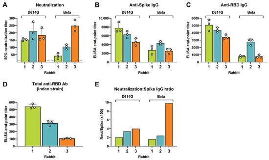 Since higher levels of antibody titers can lead to a cross-neutralization of resistant SARS-CoV-2 variants, we determined the levels of the anti-spike ectodomain IgG and the anti-RBD IgG relative to the levels of neutralizing antibodies against the D614G strain and the Beta VOC (Figure 7). Intriguingly, Rabbit 3, with the highest cross-neutralization, had the lowest spike ectodomain-binding IgG titers against the D614G spike (endpoint titer = 4584 vs. 7776 and 6294), and an even lower level of binding IgG titers against the Beta VOC spike ectodomain, although comparable to the other rabbits (endpoint titer = 2535 vs. 2747 and 4322) (Figure 7B). Anti-RBD IgG titers followed a similar pattern with endpoint titers against the D614G strain of 5087, 4377, and 3442 for Rabbits 1, 2, and 3, respectively (Figure 7C). Notably, Rabbit 3 together with Rabbit 1 had the lowest anti-RBD IgG binding titers for the Beta VOC (endpoint titers = 774 and 786, respectively, vs. Rabbit 2 = 2779) (Figure 7C).