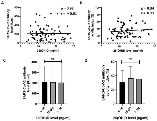 Analyzing the effect of vitamin D levels on SARS-CoV-2 antibody response in unexposed individuals. (A,B) show the correlation analysis between baseline (D0) 25(OH)D levels and the D21 level (A) or avidity index (B) of SARS-CoV-2 S1 IgG antibodies. No significant correlations were found (p > 0.05). In (C,D), the unexposed participants were divided into three groups based on the D0 levels of 25(OH)D, and the mean D21 antibody levels (C) or avidity indices (D) were compared between the groups. No significant differences in the levels or avidity were found between the groups (p > 0.05, One-way ANOVA). ns: not significant.