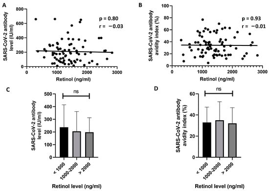 Analyzing the effect of vitamin A levels on SARS-CoV-2 antibody response in unexposed individuals. (A,B) show the correlation analysis between baseline (D0) retinol levels and the D21 level (A) or avidity index (B) of SARS-CoV-2 S1 IgG antibodies. No significant correlations were found (p > 0.05). In (C,D), the unexposed participants were divided into three groups based on the D0 levels of retinol, and the mean D21 antibody levels (C) or avidity indices (D) were compared between the groups. No significant differences in the levels or avidity of the antibodies were found between the groups (p > 0.05, One-way ANOVA). ns: not significant.