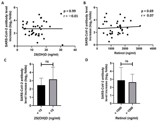 Analyzing the effects of vitamin D and vitamin A on SARS-CoV-2 antibody response in previously exposed individuals. Correlation between baseline (D0) levels of 25(OH)D (A) or retinol (B) and log2 folds of increase in SARS-CoV-2 S1 IgG antibody levels between D0 and D21 in previously exposed individuals. No significant correlation was found. In (C,D), exposed participants were dived into two groups of D0 25(OH)D levels (C) or two groups of D0 retinol levels (D). The means of log2 fold increase in SARS-CoV-2 S1 IgG antibody levels were compared between the groups. No significant difference in the antibody level increase was found between the groups (p > 0.05, t test). ns: not significant.
