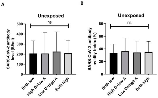 Finally, we tested the effects of the two vitamins in conjunction with each other. To achieve this, the unexposed participants were distributed into four groups according to the combined status of the two vitamins. These groups were as follows: “Both low” group included participants with a 25(OH)D level of less than 15 ng/mL and a retinol level of less than 1500 ng/mL; “High D and low A” group contains participants with a 25(OH)D levels of more than 15 ng/mL and a retinol level of less than 1500 ng/mL; “Low D and high A” group contains participants with a 25(OH)D level of less than 15 ng/mL and a retinol level of more than 1500 ng/mL; and “Both high” group contains the participants with a 25(OH)D level of more than 15 ng/mL and a retinol level of more than 1500 ng/mL. Then, the mean levels and the avidity of SARS-CoV-2 S1 IgG antibodies were compared between the groups. The results of this analyses showed no significant differences in the mean antibody levels (p = 0.98, Figure 4A) or avidity (p = 0.95, Figure 4B) between the groups. A similar analysis was not conducted on the previously exposed participants due to its relatively small size, which does not allow for the separation of these participants into four representative vitamin status subgroups.