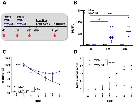 Previously, we confirmed that an MVA-based candidate vaccine against COVID-19 expressing the prefusion-stabilized SARS-CoV-2 spike protein (MVA-ST) was immunogenic and effective when tested on k18-hACE2 mice (6–8 weeks old) and hamsters (10 weeks old) []. These results demonstrated safety, immunogenicity and protective outcomes in adult animals. Moreover, the safety and robust activation of the specific immune responses of this MVA-ST candidate vaccine have been confirmed in phase I clinical testing in humans (unpublished data).