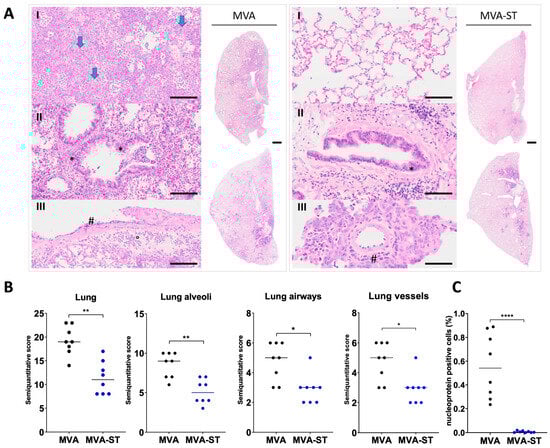 The pathohistological analysis of the hematoxylin-and-eosin-stained lung sections revealed large areas of lung consolidation and inflammation in the control hamsters (Figure 3A). In the alveolar lesions, we detected the accumulation of neutrophils and mononuclear cells, which also expanded to the alveolar septa and filled the alveolar lumina. These pathological changes were significantly reduced or nearly absent in the MVA-ST-vaccinated animals (Figure 3A,B). In the lungs of the MVA-vaccinated hamsters, we detected epithelial hyperplasia in the conductive airways and moderate numbers of macrophages, degenerated heterophils and sloughed epithelial cells within the airway lumen. Similar lesions in the conductive airways were significantly reduced or absent in the MVA-ST-vaccinated hamsters (Figure 3A,B). In the lungs of the MVA-control-vaccinated hamsters, we detected significantly marked vascular lesions compared to the MVA-ST vaccinated hamsters, in which they were almost absent. The vascular lesions mainly consisted of histiocytic–heterophilic perivascular and intramural infiltrates, including abundant perivascular edema and perivascular cuffing (Figure 3A,B). Most importantly, the alveoli of the MVA-vaccinated hamsters were completely obliterated by high numbers of heterophils, macrophages, extravasated erythrocytes and occasional fibrin or edema. On the other hand, the MVA-ST-vaccinated hamsters displayed normal alveoli, very often free of inflammatory changes, with a significantly lower histopathological score (Figure 3A,B). Notably, both groups occasionally showed alveolar septa covered by proliferating type II pneumocytes.