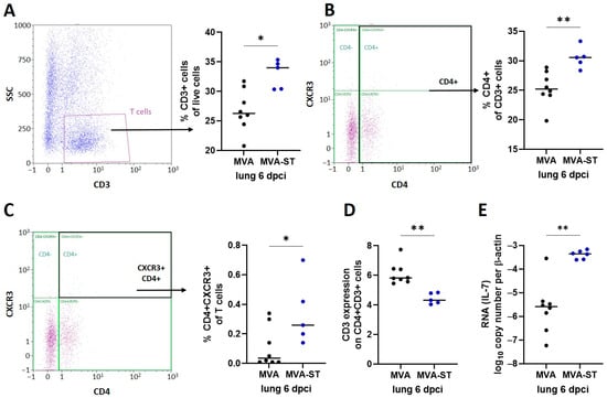 Immune responses in the lung after MVA-ST vaccination. Six days after SARS-CoV-2 infection, lung cells were prepared and evaluated in flow cytometry for (A) CD3-, (B) CD4- and (C) CXCR3-specific antibodies. (D) CD3 expression on CD3 + CD4+-positive lung cells shown by median fluorescence intensity (MFI) and (E) levels of IL-7 in lungs measured by qRT-PCR. Differences between groups analyzed by t-Test, Mann–Whitney test or two-way ANOVA. Asterisks represent statistically significant differences between two groups: * p < 0.05, ** p < 0.01.