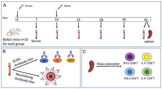 Animal immunization and sample analysis strategy. Balb/c mice were immunized at days 0 and 14. Serum was collected at 7, 14, 21, 28, 35, and 42 days, and spleens were isolated 42 days post-primer vaccination (A). Antibodies against S, RBD, N proteins, and neutralizing antibody in mouse serum were detected via indirect ELISA and microneutralization test methods (B). Spleens were analyzed using flow cytometry to measure the percentages of IFN γ+ and IL 4+ in CD4+/CD8+ T cells, respectively (C).