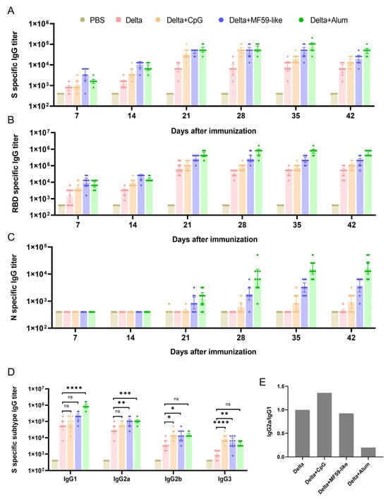 Serum binding antibody titers after immunization. Five groups of mice (n = 10) were immunized with Delta inactivated vaccine with different adjuvants at 14-day intervals. The changes in antibody titers against the S protein (A), RBD (B), and N protein (C) in serum at 7, 14, 21, 28, 35, and 42 days after the first immunization were measured. IgG isotype analysis against S protein was performed on serum 42 days after immunization, antibody titers against IgG1, IgG2a, IgG2b, and IgG3 were detected (D), and the relative values of IgG2a/IgG1 and the unadjuvanted Delta vaccine group were calculated (E). The data points represent the values detected from each mouse, the reference column height is the geometric mean of the titer (GMT), and the error bars indicate the 95% confidence interval. Statistical analyses were conducted using one-way ANOVA with Dunnett’s multiple comparisons test. ns, p > 0.05; *, p < 0.05; **, p < 0.01; ***, p < 0.001; ****, p < 0.0001.
