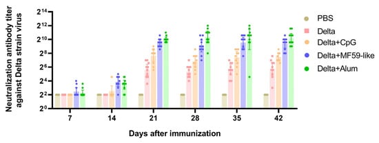 The serum neutralization titer was detected using a micro-neutralization assay. The live virus of the Delta strain was used for micro-neutralization experiments, and the serum neutralizing antibody titers of mice 7, 14, 21, 28, 35, and 42 days after the first immunization of each group were detected. The data points represent the values detected from each mouse, the reference column height is the geometric mean of the titer (GMT), and the error bars indicate the 95% confidence interval.