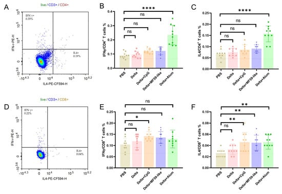 T cell immune responses in the vaccinated BALB/c mouse spleens. BALB/c mice received two doses of the inactivated Delta vaccine with various adjuvants at 14-day intervals. Splenocytes, isolated 42 days post-initial vaccination and stimulated with a SARS-CoV-2 S peptide pool, were analyzed using flow cytometry. The gating strategy of IFNγ/IL4 positive cells in CD3+CD4+/CD3+CD8+ T cells are presented in panel (A) and (D). The results of percentages of IFN γ+ in CD4+ T cells (B); IL 4+ in CD4+ T cells (C); IFN γ+ in CD8+ T cells (E) and IL 4+ in CD8+ T cells (F), respectively. Data are presented as mean ± SEM (n = 10). Statistical analyses were conducted using one−way ANOVA with Dunnett’s multiple comparisons test. ns, p > 0.05; *, p < 0.05; **, p < 0.01; ****, p < 0.0001.