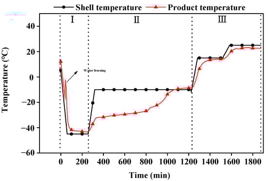 Stages of the freeze-drying procedure. I: At the pre-freeze stage, samples are frozen to −45 °C within 1 h and maintained at this temperature for 3 h. II: Primary drying is carried out by warming to −10 °C within 1 h and then maintaining this temperature for 15 h. III: The secondary drying occurs in two stages. Initially, the temperature is increased to 15 °C for one hour and sustained for four hours, followed by a further increase to 25 °C for one hour, which is then sustained for five hours.
