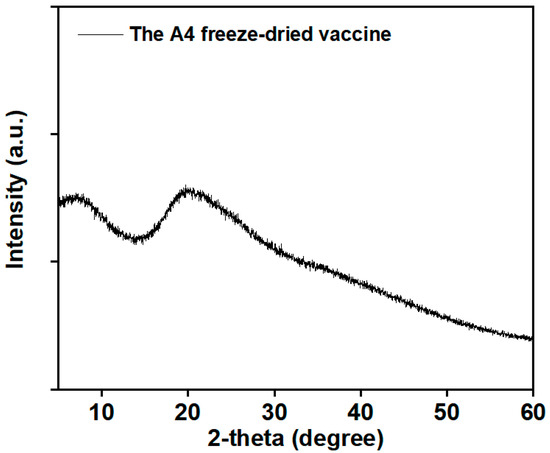 As shown in Figure 6, the A4 freeze-dried vaccine revealed the absence of characteristic peaks from crystalline forms in the XRD pattern. The sample tested was the amorphous material.