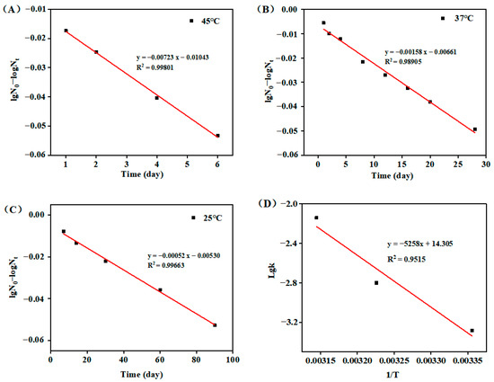 The decay rate constant K at different temperatures: (A) 45 °C; (B) 37 °C; (C) 25 °C. Diagram of the relationship between 1/T and the deactivation rate constant (D).