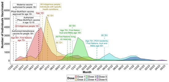 The first COVID-19 vaccines approved for use in Canada were Pfizer BNT162b2, which was authorized by Health Canada on 9 December 2020 [], followed by Moderna mRNA-1273 on 23 December 2020 []. Vaccinations in the province of Manitoba began on 16 December 2020, starting with healthcare workers working in direct contact with patients in critical care or long-term care facilities []. Vaccination eligibility expanded to the public in early 2021, starting with individuals ≥95 years old and First Nations people ≥75 years old [,]. The age of eligibility was incrementally decreased over the following months with increasing vaccine availability. Approximately 79% of Manitobans had received the primary series of COVID-19 vaccines as of September 2023 []. However, only 18.2% of Manitobans have received their primary COVID-19 vaccination series and all recommended booster doses as of March 2024 []. The current vaccination recommendations in Canada includes having received the recommended number of XBB.1.5 COVID-19 vaccines for one’s age group and health status, and having completed their primary series or received a booster dose within the last 6 months [].