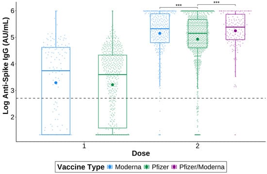 SARS-CoV-2 anti-spike IgG after the first and second doses of a COVID-19 vaccine. Specimens were vaccinated with either one dose of Pfizer BNT162b2 (green) or Moderna mRNA-1273 (blue), or with two doses of Pfizer BNT162b2 or Moderna mRNA-1273 or one dose of each (Pfizer/Moderna; purple). Only specimens negative for anti-nucleocapsid IgG were included. The larger dots are the mean. The smaller dots represent individual samples. The dashed line indicates a positive signal cut-off of 15 AU/mL. *** p ≤ 0.001.