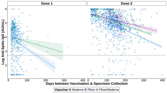 Data analysis was carried out using R Studio (v. 2023.12.1+402). Figures were generated using the ggplot2, ggh4x, and ggbeeswarm packages [,,]. Tables were made using the gtsummary package []. Statistical analysis was conducted using the rstatix, stats, and emmeans packages [,,]. For the anti-S IgG analyses, specimens were grouped according to dose, age group, and vaccine type. Only specimens that had been vaccinated 14+ days before specimen collection were included. Those with positive anti-N IgG were excluded from analysis due to previous COVID-19 infection. The Kruskal–Wallis test was used to determine statistical significance, followed by Dunn’s Multiple Comparison Test using the Bonferroni adjustment for multiple comparisons. p values of ≤0.05 were considered significant. Linear regression was used to examine the effect of time post-vaccination on anti-spike IgG titres, followed by analysis of covariance (ANCOVA) and emmeans post-hoc tests to determine whether the regression slopes for each vaccine were significantly different from one another.