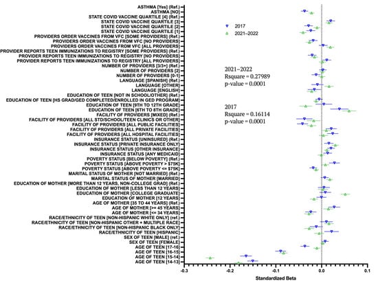 Regression analysis between different variables in a category for vaccination rates in 2017 and 2021–2022. Blue values show the results for the years 2017, while green values show the results for 2021–2022. The 2017 regression: F(38, 15,025) = 75.95, p < 0.001; 2021–2022 regression: F(38, 22,571) = 230.8649, p < 0.001. All statistical test results are located in Supplementary Materials S1.