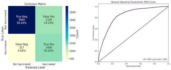 Furthermore, it might be useful at a population level to inform public health decisions. For example, if we could estimate the vaccination rates among youth in a particular geographical area, it might provide insight into community disease burden and inform decisions about influenza vaccination campaigns. Because relatively few teens had received multiple vaccines in the prior three years, we converted the flu vaccination status to a binary variable, indicating whether individual youths had received at least one flu vaccine in the prior three years. We evaluated our ability to predict this status based on multivariate patterns among the independent variables. Since our non-stepwise regression analysis demonstrated that relationships between the independent variables and flu vaccination status were stable across years, we assumed that we could perform model selection and identify the optimal hyperparameters for a classification model by using the 2017 data only and that these findings would generalize to the 2021–2022 data. This process identified XGBoost as the best-performing algorithm (see Methods). We then trained this algorithm on data from 27,834 respondents from the 2021–2022 data and made probabilistic predictions for the remaining 6959 respondents (test set). The predictions resulted in an AUROC of 0.84 (Figure 2). Table 2 and Figure 2 provide additional insight into the model’s performance based on a probability threshold of 0.5. Of the test-set respondents, 5236 (75.2%) reported not having received the flu vaccine in the prior three years; the model correctly identified 3885 (74.3%) of these respondents. Of the 1723 test-set respondents who had not received the flu vaccine in the prior 3 years, the model correctly identified 1406 (81.6%) of these individuals. Figure 2 illustrates the class imbalance (far more unvaccinated teens than vaccinated) and its tendency to over-predict the frequency of teens who are vaccinated. Accordingly, it appears our efforts to adjust for the imbalance between vaccinated and unvaccinated individuals were helpful.