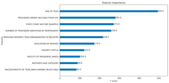 Our model shows that identifying as being non-Hispanic Black was a negative predictor of flu vaccination. The effect is small compared to other factors, but it is consistent with previous research in the field [35,36]. The differences in non-vaccination rates between non-Hispanic Blacks (78.18%) and non-Hispanic Whites (73.78%) are thought to be moderated by a complex array of cultural and socioeconomic factors [37]. A useful evaluation of these factors is not possible using NIS-Teen survey data.