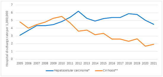 Total hospital discharge rate values for cirrhosis and hepatocellular carcinoma as the main diagnoses in chronic hepatitis B infections (2005–2021). * Significant increasing trend, p = 0.006. ** Significant decreasing trend, p < 0.001.