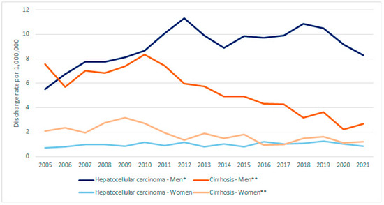 Hospital discharge rate values by sex for cirrhosis and hepatocellular carcinoma as the main diagnoses in chronic hepatitis B infection (2005–2021). * Significant increasing trend, p = 0.006. ** Significant decreasing trend, p < 0.001.
