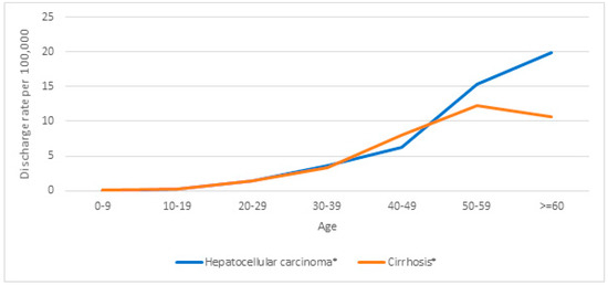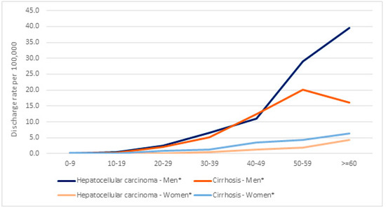 The highest hospital discharge rate for chronic HBV-related discharges occurred in men: for HCC in men older than 60 years and for cirrhosis in men aged 50–59 years. The male-to-female ratio for HCC was 8.9, and for cirrhosis was 2.9.
