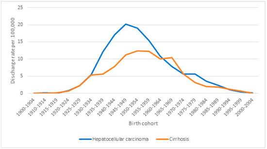 Figure 3 and Figure 4 show hospital discharge rates per 100,000 people for HCC and cirrhosis according to age group and sex, respectively, showing significant increasing trends (p < 0.001) overall, by age, and for men and women separately. Figure 5 shows hospital discharge rates per 100,000 people for HCC and cirrhosis by birth cohort. The highest values observed were 202.2 for HCC in the 1945–1949 age cohort and 12.4 for cirrhosis in the 1950–1955 cohort.