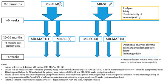 The pivotal Phase III trial, which should be an individually randomized (1:1), open-label NI trial to receive an MR-MAP or MR-SC at 9–10 months of age to assess safety and non-inferiority of immunogenicity of MR vaccines delivered by a MAP, six weeks after the first dose of the MR vaccine. Dependent upon the NRA and the WHO PQ team review and agreement of the proposed pivotal Phase III trial framework, the trial could continue in a subset of children who would be randomized to receive either the same vaccine presentation or a different vaccine presentation 6 months after the first MR dose, at 15–16 months of age. The trial should be conducted in countries where MR-MAPs are to be utilized programmatically and in representative populations regarding health status, informed by the use cases and projected demand for the product in LMICs.