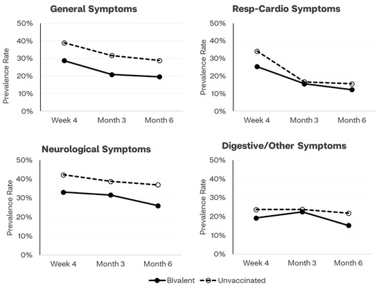 Time trends of prevalence rates of long COVID symptoms by vaccination status and by category of symptoms are presented in Figure 1. Across all time points, the symptoms prevalence line for the bivalent cohort is below and clearly separated from the line presenting trends for the unvaccinated cohort, for general, neurologic, and digestive/other symptoms.