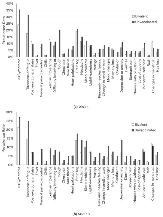 To our knowledge, this is the first study that shows the impact of bivalent vaccination on long COVID outcomes. While side-by-side comparisons with other studies are impaired by design and methodological differences, our results are generally in line with prior work on long COVID. Our observed prevalence rates of long COVID are in line with published estimates among non-hospitalized US patients [2,3,4,5,6,7,15,25,26]. Four weeks after the initial infection, approximately 30% of study participants reported experiencing at least three symptoms consistent with long COVID, and 40% reported experiencing at least two symptoms. Those percentages reduced to, respectively, 21% and 33% six months after the initial infection. These results are within ranges found in other studies reporting a prevalence of long COVID from 10% to 50% between one and six months following the initial infection and onset of symptoms. However, while some of those studies included asymptomatic patients [4,25], our study included exclusively the symptomatic population, with 100% of participants reporting ≥1 acute symptom at baseline (per protocol), and ≥1 symptom consistent with long COVID four weeks after infection.