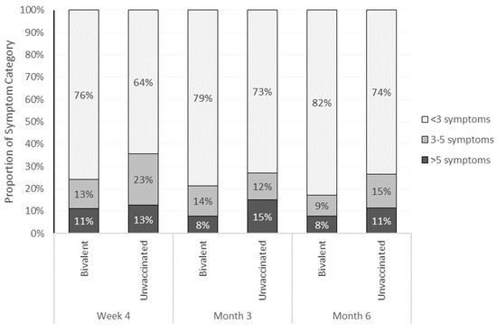 The study participants were stratified in three ordinal categories of self-reported symptoms: <3, 3–5, >5 symptoms. The bivalent cohort presented with lower symptom burden compared with the unvaccinated cohort. This was observed consistently across all time points (Figure 3 and Supplementary Table S1).