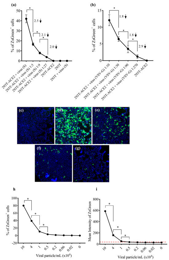 Detection of viral titers via automated imaging analysis protocol: the percentage of ZsGreen+ cells and average fluorescence intensity were measured by using the image-based analysis protocol. (a) Pseudoviruses expressing the Wuhan-Hu-1 spike glycoprotein are functional, as only HEK293T-ACE2 cells were transduced. Numbers above the graphic line and the arrows denote the reduction fold calculated by the ratio between viral amounts. (b) VSV g-expressing particles were used as a transduction control since both cell lines express the receptor for this ligand. Numbers above the graphic line denote the reduction fold calculated via the ratio between viral amounts. Fluorescence images of (c) bald pseudoviruses, (d) undiluted Wuhan-Hu-1 spike-expressing pseudoviruses, (e) Wuhan-Hu-1 pseudoviruses diluted 3-fold, (f) diluted 9-fold, and (g) diluted 27-fold, as illustrated by decreasing numbers of ZsGreen+ cells. The protocol was shown to both (h) detect decreasing levels of Wuhan-Hu-1 pseudovirus titers based on the percentage of ZsGreen+ and (i) on the average fluorescence intensity. The red line represents the calculated cut-off value (39 a.u.). Data are shown as mean ± SD. * One-way ANOVA, followed by Holm–Sidak’s multiple comparisons test, p < 0.05, calculated by using GraphPad Prism, version 8.0.