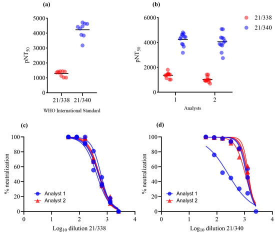 Precision tests of the automated imaging analysis. Pseudoviruses expressing the Wuhan-Hu-1 spike glycoprotein were included with WHO 21/338 and 21/340 standard serum samples. The pNT50 was calculated, as well as the CV in the same (intra-assay) or independent experiments (inter-assay). (a) Intra-assay: 3 independent experiments were performed by one researcher. Data were pooled to represent the variation among the samples. (b) Inter-assay analysis: 2 researchers performed 3 independent assays. Data were pooled to represent the variation among the samples. (c,d) Nonlinear curves regarding the precision assays.