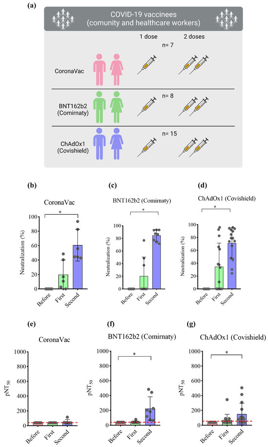 Percentage of neutralization and pNT50 values in volunteers immunized with different vaccines. (a) Schematic representation of the cohorts of volunteers tested. Blood from healthy volunteers was collected prior to and 30 days after the first and second doses of three different vaccines against SARS-CoV-2. Serum was collected and stored at −80 °C until use. Samples were tested with neutralization assay kit using recombinant HRP-conjugated RBD of the Wuhan-Hu-1 spike glycoprotein. (b–d) Percentage of neutralization of serum from volunteers immunized with CoronaVac (n = 7), Comirnaty (n = 8), or Covishield (n = 15), respectively, at 1:40 dilution. (e–g) pNT50 of volunteers immunized with CoronaVac (n = 7), Comirnaty (n = 8), or Covishield (n = 15), respectively. Values considered statistically significant when p < 0.05 (*) via the Friedman test, followed by Dunn’s multiple comparisons test, calculated by using GraphPad Prism, version 8.0. Data are shown as mean ± SD. Circles indicate the volunteers, and red line indicate the lowest pNT50 value equal to 40.