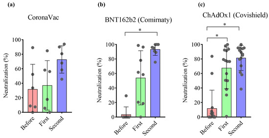 Imaging-based analysis detects the neutralizing capacity of volunteers after vaccination and following boost with (a) CoronaVac, (b) Comirnaty, or (c) Covishield against Wuhan-Hu-1 spike glycoprotein pseudovirus. Samples were submitted to the neutralization image-based assay for method validation. The neutralization capacity of serum specimens was determined by the transduction of HEK293T-ACE2 cells using Wuhan-Hu-1 spike-expressing pseudovirus. Values were considered statistically significant when p < 0.05 (*) examined using Friedman test, followed by Dunn’s multiple comparisons test, calculated by GraphPad Prism, version 8.0. Data are shown as mean ± SD. Circles indicate the volunteers.