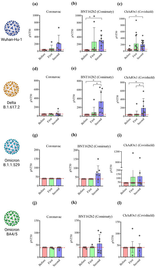 Imaging-based analysis characterizes cohorts based on the vaccine administered and number of doses. Validated samples were diluted and submitted to the neutralization image-based assay. Serum potency (pNT50) was determined via nonlinear regression as a function of titers log10 and the inhibition of pseudovirus infection. The pseudoviruses produced expressed (a–c) Wuhan-Hu-1, (d–f) Delta B.1.617.2, (g–i) Omicron B.1.1.529, or (j–l) Omicron B.A4/5 spike proteins. Values considered statistically significant when p < 0.05 (*) by using Friedman test, followed by Dunn’s multiple comparisons test, calculated by using GraphPad Prism, version 8.0. Data are shown as mean ± SEM. Circles indicate the volunteers, and red line indicate the lowest pNT50 value equal to 40.