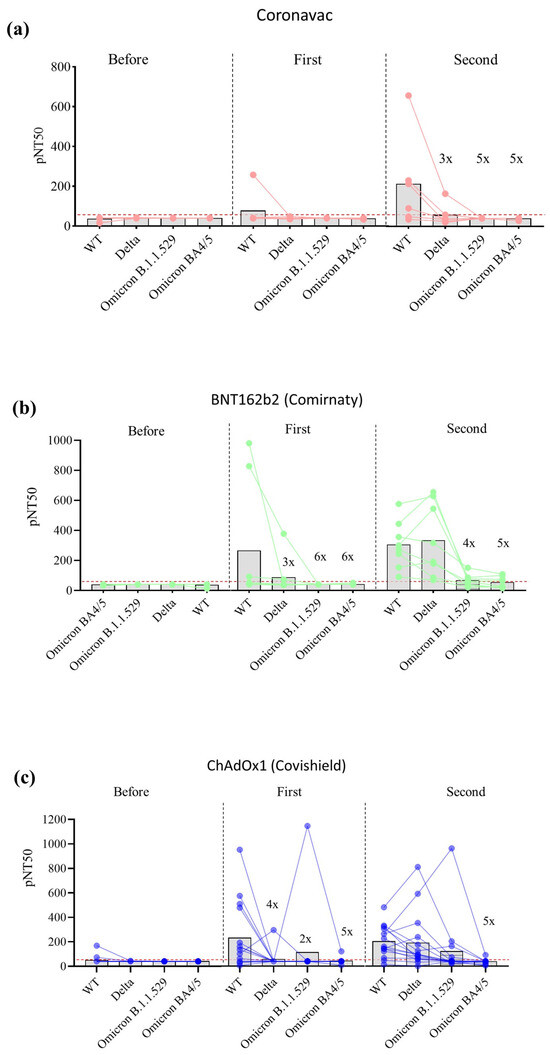 These samples were submitted to the imaging-based protocol to determine the potency of neutralizing antibodies. Pseudoviruses at MOI 0.6 were used for each spike variant, resulting in 34.4 ± 7.2% of ZsGreen+ cells for wild-type virus, 26.2 ± 13.8% for Delta, 43.6 ± 6.5% for Omicron B.1.1.529, and 9.8 ± 1% for Omicron BA4/5. This viral amount was enough to produce at least a 30-fold increase in the ZsGeen mean fluorescence intensity, which can distinguish transduced and non-transduced cells. The samples were tested at a 1:40 dilution to determine the percentage of neutralization against the Wuhan-Hu-1 spike glycoprotein pseudovirus. Samples from volunteers prior to vaccination presented a maximum level of 32% pseudovirus neutralization. The first dose of Covishield significantly increased neutralization. A similar profile was not observed after receiving the first dose of CoronaVac and Comirnaty. Following the second dose, Comirnaty and Covishield significantly increased neutralization capacity compared to before vaccination (Figure 5a–c). Serum potency was determined via nonlinear regression and is represented as pNT50. Samples from volunteers vaccinated with CoronaVac presented pNT50 at the detection limit of 40, with enhanced serum potency of 213 only following the second dose. However, based on paired analysis, the second dose of CoronaVac did not significantly increase the neutralization capacity of the sera. Samples from naïve volunteers before receiving Comirnaty presented a potency at the detection limit, which increased to 265 after the first dose. In these individuals, pNT50 was significantly higher than before vaccination after receiving a second dose of Comirnaty. A similar profile was found in samples of volunteers vaccinated with Covishield. In this case, pNT50 significantly increased from 40 to 231 after the first dose and remained at 203 after the second dose (Figure 6a–c). Nonlinear regression curves are shown in Figure S6A–C. These data are consistent with the neutralizing antibody measurements obtained using ELISA despite slight increases in pNT50 mean values detected by the imaging-based assay (Figure S7).