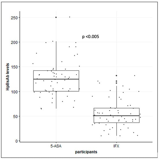 In the present study, the mean HBsAb titer levels were significantly lower in the IFX group when compared to the 5-ASA group. Similar results were observed in the study by Gisbert et al. []. The study aimed to evaluate the impact of immunosuppressors and anti-tumor necrosis factor (anti-TNF) agents on HBV vaccine. In total, 241 vaccinated patients with IBD were recruited, and the response rate (HBsAb) was lower in patients who were receiving anti-TNF therapy. Similarly, a study by Altunöz and colleagues displayed that IBD patients receiving several IBD-related medications had a lower response rate to HBV vaccination compared with patients without any immunosuppressive medication [].