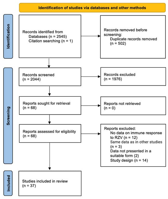 We conducted a comprehensive literature search from inception up to 31 August 2023, with an update on 9 October 2023, in multiple databases, including PubMed/MEDLINE, Embase, Web of Science, and Global Index Medicus. Supplemental Table S1 details the search strategy. Additionally, we reviewed the reference lists of the full texts we included in our analysis. The results were restricted to articles in English, French, German, Italian, and Spanish. We did not set any time limit on dates of published articles. During the screening process, two reviewers (L.L. and I.C.A.) independently assessed titles, abstracts, and full texts of the studies identified in our searches. Any discrepancies between reviewers regarding title and abstract screening, full-text review, or reasons for exclusion were resolved through group discussion with the principal investigator (P.F.). Populations eligible for this review were anyone aged 18 years or older who received two doses of RZV. Eligible study designs included: (i) primary reports published as randomized controlled trials (RCT), quasi-RCT (qRCT), cohort, cross-sectional, and case–control studies; (ii) original reports accessible in full-text; (iii) studies indicating time between vaccination and testing. Records not reporting immunogenicity data as well as those published as reviews, case report, conference abstract, position paper, editorial, commentary, and letters without original data were excluded. Inclusion/exclusion criteria were developed according to the PICOS (Participants, Interventions, Control, Outcomes, Study Design) framework and detailed in Table S2 (Supplementary Materials). Two reviewers (L.L. and I.C.A.) assessed the possible risk of bias using the Cochrane risk of bias tool and the JBI (formerly Joanna Briggs Institute) checklist for RCTs and non-randomized experimental studies, respectively [,].