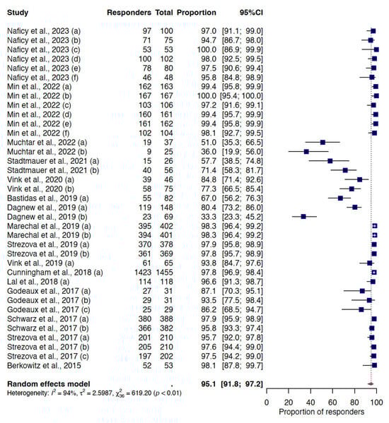 Random-effect meta-analysis of the VRR for humoral immunity one month following RZV-dose 2. Letters in brackets indicate the different reports extracted from individual studies included. For the complete list of included studies, please refer to the Supplementary Materials, Supplementary S1. Abbreviations: VRR, vaccine response rate; RZV, recombinant zoster vaccine; 95%CI, 95% confidence interval.