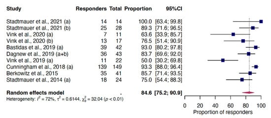 The analysis of the CMI VRR was calculated on 391 recipients enrolled in 10 reports, resulting in a pooled proportion of 84.6% (95%CI 75.2–90.9) one month post-dose-2 (Figure 4). The results of the subgroup and meta-regression analyses (Tables S7 and S8, Supplementary Materials) show a reduced response when the two doses are administered less than 2 months apart, with a 19.4% (95%CI 5.8–40.0) reduction in the response rate between administrations at one and one/two months vs. two months. Excluding the single report that included only healthy individuals [], this reduction remained at 16.0% (95%CI 3.3–35.7). A post hoc analysis of median CD42+ frequency values extracted from the studies included in the CMI meta-analytic model, though, did not reveal any differences based on the time between the two doses (Figure S1, Supplementary Materials).