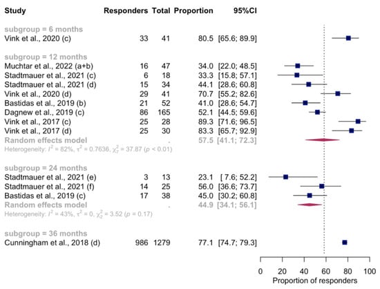 Time-varying pooled VRRs (with 95%CI) of the proportion of RZV recipients with positive cell-mediated immunity response, by time since vaccination following RZV-dose 2. Only studies meeting criteria for inclusion in the meta-analysis were pooled. Letters in brackets indicate the different reports extracted from individual studies included. For the complete list of included studies, please refer to the Supplementary Materials, Supplementary S1. Abbreviations: VRR, vaccine response rate; RZV, recombinant zoster vaccine; 95%CI, 95% confidence interval.