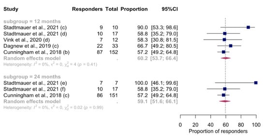 Considering the studies that met inclusion criteria in the meta-analysis, longer longitudinal serological assays from 13 reports revealed a progressive decline in the humoral VRR from 6 to 24 months after vaccination (Figure 5). Figure 6 shows longitudinal analyses of CMI-specific VRR at 12- and 24-month follow-ups, in which the proportion of vaccinated people with a positive cell-mediated response remained at around 60%. For both humoral and CMI long-term VRR, it was not possible to proceed with subgroup analyses or meta-regression because of the low number of reports (<10 for each post-vaccination timepoint). In the remaining part of the studies not included in the synthesis model, the decline in either or both humoral immunity (in terms of GMC/antibody titer) and CMI (expressed as CD42+ T-cell frequency) was confirmed, but in all the studies it was found that the level remained higher than the baseline. These data were confirmed at different timepoints up to 10 years after vaccination [,,,,,,,,,,,].