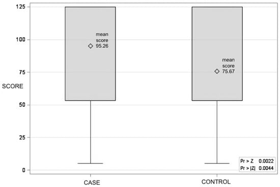 The Wilcoxon rank-sum score distribution for COVID-19 vaccine propensity between case and control groups (CASE: mean score 95.26; CONTROL: mean score 75.67; p = 0.0044).