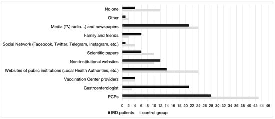 It was found that among the various sources of information available to IBD patients and controls about COVID-19 immunization (multiple preferences were allowed), PCPs were the most preferred source. However, gastroenterologists were more relevant for IBD patients. The media, newspapers, and websites of public institutions were also important sources of information. On the other hand, social networks were the least preferred option. Regarding the recommendations received from physicians to get vaccinated against COVID-19, it was found with statistical significance (p < 0.0001) that IBD patients relied heavily on their gastroenterologists (33.8%) for advice, while the control group relied mainly on their PCPs (44.9%). Moreover, a significant proportion of IBD patients and controls reported that they had not received any recommendation from medical professionals to get vaccinated against COVID-19 (IBD 33.7% vs. 53.8% control group) (Figure 2) (Table 5).