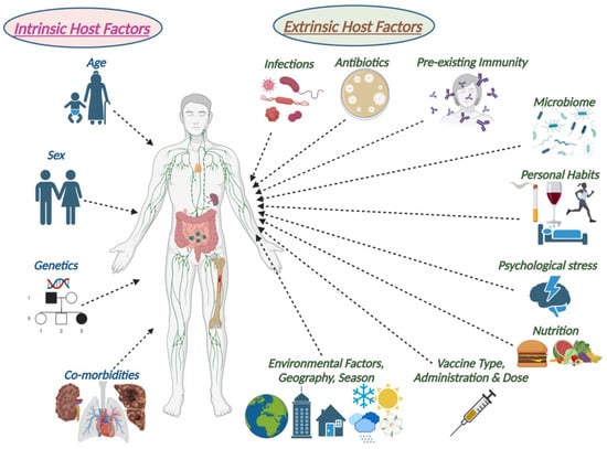 Intrinsic and extrinsic host factors that influence the immune response to vaccination. Adapted from [12] and created with BioRender.com.