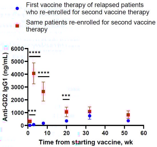Thirty-two patients who were treated with the vaccine had relapsed. Upon achieving clinical remission, they were re-enrolled in the same vaccine protocol. Their anti-GD2 IgG1 titer was measured by ELISA and expressed as mean ± SEM. Using the Wilcoxon matched-pairs signed-rank test, a statistically significant difference was observed at week 1, week 3, week 8, and week 20 for these patients by comparing their antibody titers during their first vaccine therapy and their second vaccine therapy. *** p ≤ 0.002, **** p ≤ 0.0001.