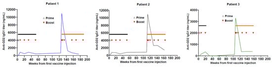 ). The timing of prime and boost was indicated. Months from the last upfront vaccine to the first injection during re-enrollment were as follows: 16.6 m for patient #1, 13.4 m for patient #2, and 12.0 m for patient #3.