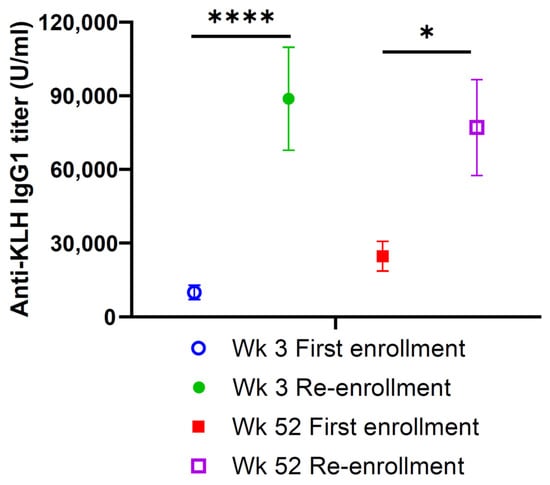 Besides the anti-hapten (GD2) antibody response, the anti-carrier (KLH) antibody response was also analyzed (Figure 5). It was observed that the anti-KLH antibody increased during the first enrollment, but with re-enrollment, the titer had a marked surge by vaccine injection #3. This high anti-KLH titer persisted through the end of vaccine treatment at week 52, significantly above the week 52 titer during the first enrollment.