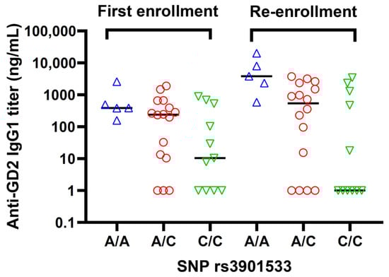 The association between antibody titers in the presence of oral β-glucan, which was administered to the patients until the end of treatment, and dectin-1 SNP rs3901533 was explored among these relapsed patients. β-glucan was known to enhance antibody-dependent cell-mediated cytotoxicity in the presence of anti-tumor antibodies. Its potential as a vaccine adjuvant is novel. β-glucan binds to the dectin-1 receptor on dendritic cells. Our previous reports found that the anti-GD2 IgG1 response in the vaccine trial correlated with dectin-1 SNP rs3901533 [,]. As shown in Figure 6, patients with genotype C/C had a significantly lower average antibody titer than those carrying either the A/A or A/C genotypes (p = 0.01). At the first enrollment, a similar trend was observed. However, the association was not statistically significant (p = 0.14).